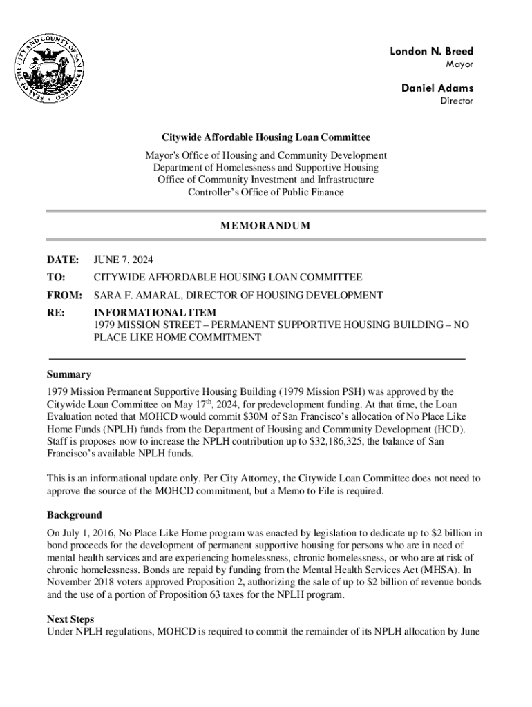 London N. Breed MayorDaniel Adams DirectorCitywide Affordable Housing Loan Committee Mayor\'s Office of Housing and Community Development Department of Homelessness and Supportive Housing Office of