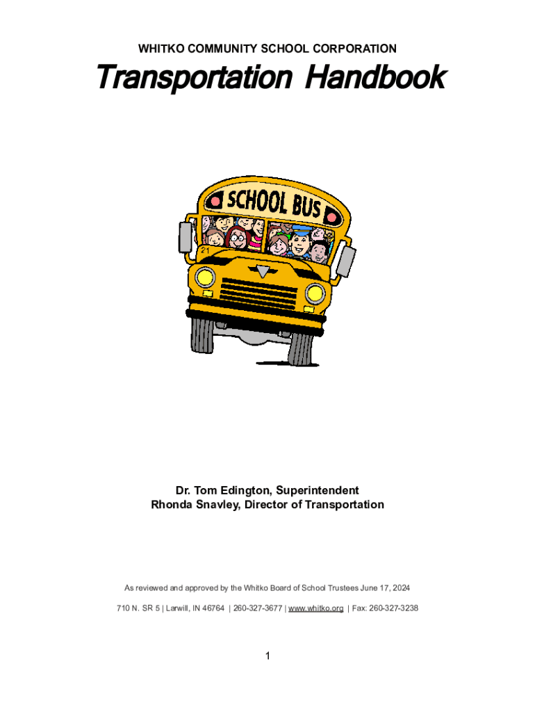 WHITKO COMMUNITY SCHOOL CORPORATIONTransportation HandbookDr. Tom Edington, Superintendent Rhonda Snavley, Director of TransportationAs reviewed and approved by the Whitko Board of School Trustees