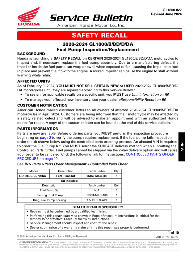 Service BulletinGL1800 #27 Revised June 2024Ame RIC an n H on d an Mot or C o., In c.SAFETY RECALL 20202024 GL1800/B/BD/D/DA Fuel Pump Inspection/ReplacementBACKGROUND Honda is launching a SAFETY