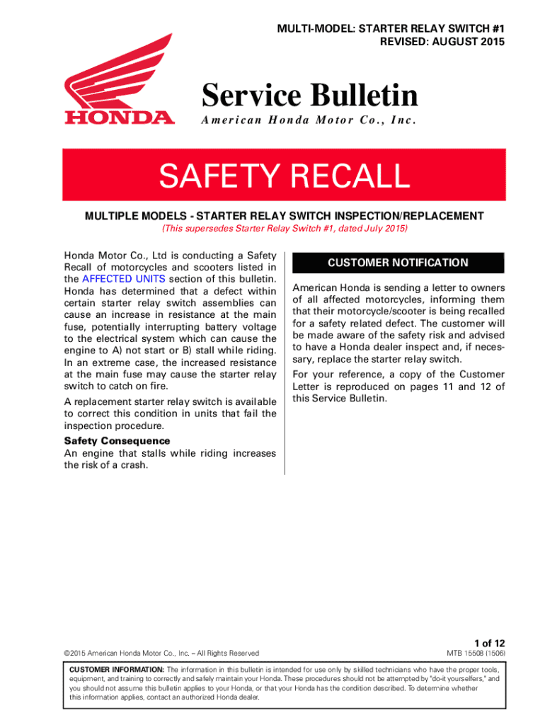 MULTIMODEL: STARTER RELAY SWITCH #1 REVISED: AUGUST 2015Service Bulletin American Honda Motor Co., Inc.SAFETY RECALL MULTIPLE MODELS STARTER RELAY SWITCH INSPECTION/REPLACEMENT (This supersedes Starter