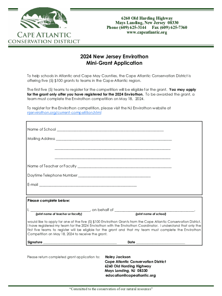 6260 Old Harding Highway Mays Landing, New Jersey 08330 Phone (609) 6253144 Fax (609) 6257360 www.capeatlantic.org2024 New Jersey Envirothon MiniGrant Application To help schools in Atlantic and Cape