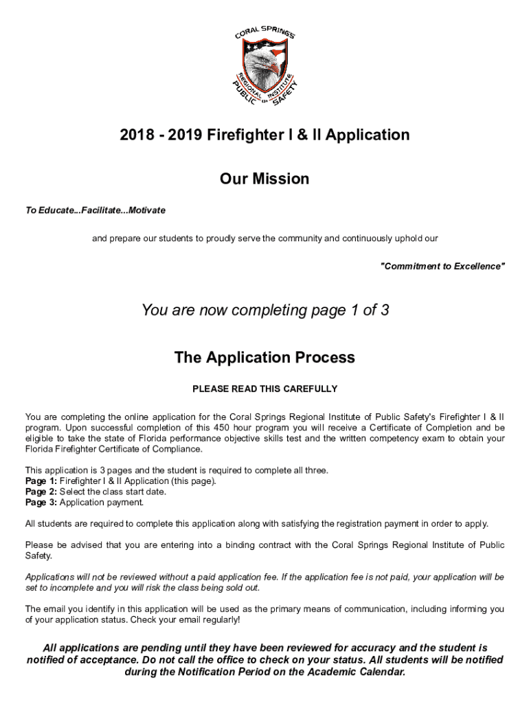 2018 2019 Firefighter I & II Application Our Mission To Educate... Facilitate... Motivate and prepare our students to proudly serve the community and continuously uphold our \”Commitment to Excellence\”You