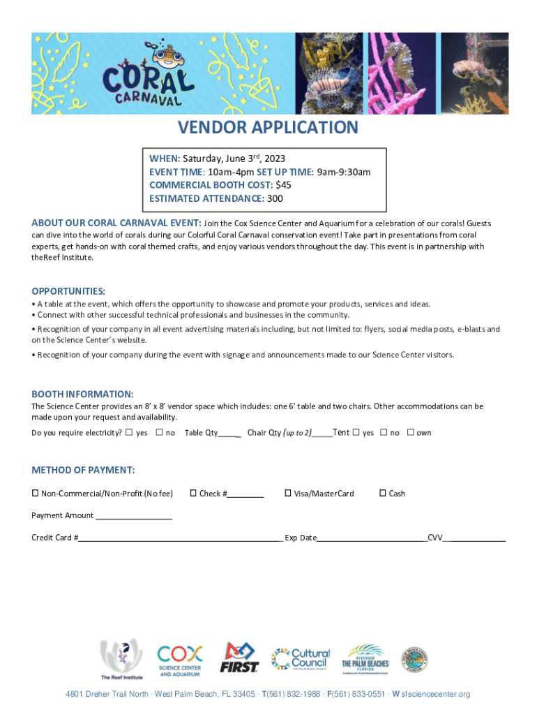 VENDOR APPLICATION WHEN: Saturday, June 3rd, 2023 EVENT TIME: 10am4pm SET UP TIME: 9am9:30am COMMERCIAL BOOTH COST: $45 ESTIMATED ATTENDANCE: 300 ABOUT OUR CORAL CARNIVAL EVENT: Join the Cox Science