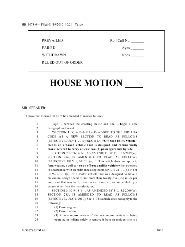 HB 10786 Filed 01/19/2010, 10:24 YardePREVAILEDRoll Call No. ___FAILEDAyes ___WITHDRAWNNoes ___RULED OUT OF ORDERHOUSE MOTION ___ MR. SPEAKER: I move that House Bill 1078 be amended to read as follows:
