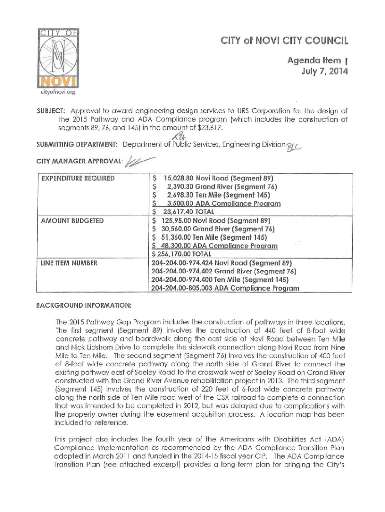 CITY of NOVI CITY COUNCIL Agenda Item 1 July 7, 2014SUBJ ECT: Approval to award engineering design services to URS Corporation for the design ofthe 2015 Pathway and ADA Compliance program (which includes