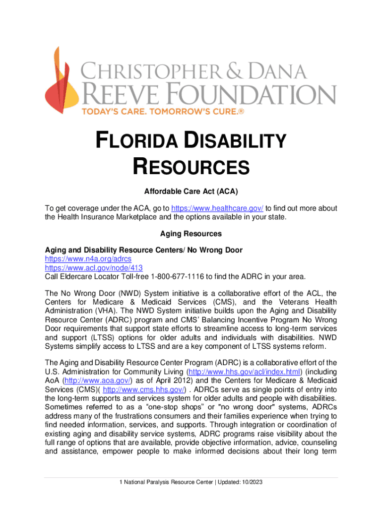 FLORIDA DISABILITY RESOURCES Affordable Care Act (ACA) To get coverage under the ACA, go to https://www.healthcare.gov/ to find out more about the Health Insurance Marketplace and the options available