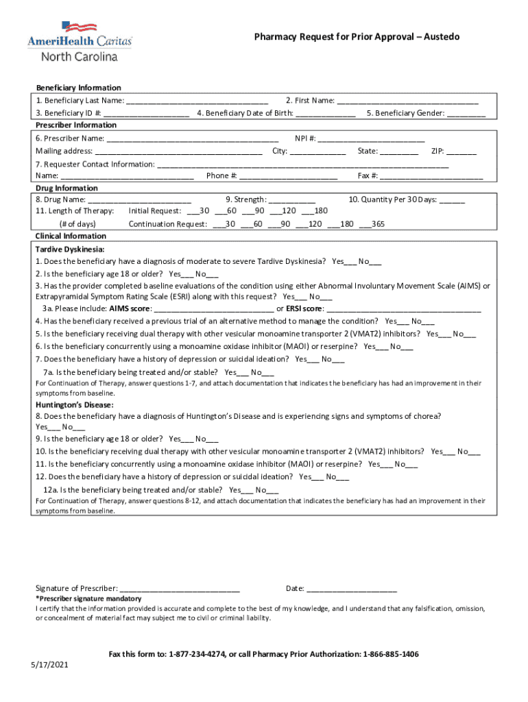 The Austedo form can be filled out online through the Amerihealth portal or submitted via mail with the required information.