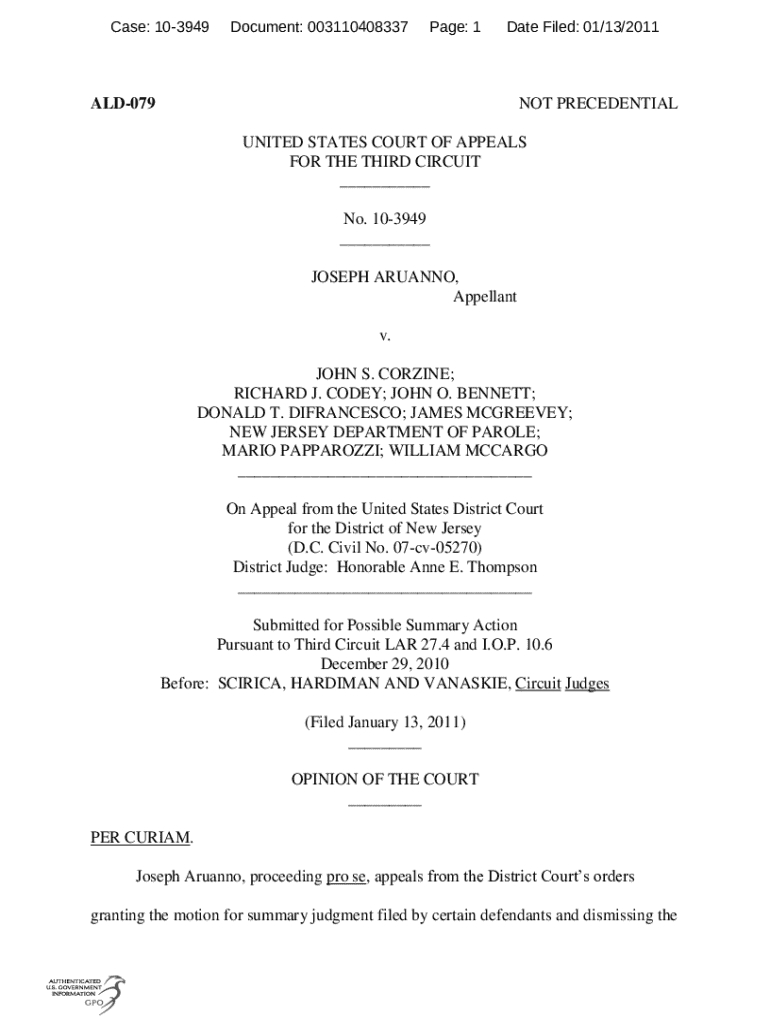 Case: 103949Document: 003110408337Page: 1Date Filed: 01/13/2011ALD079NOT PRECEDENTIAL UNITED STATES COURT OF APPEALS FOR THE THIRD CIRCUIT ___ No. 103949 ___ JOSEPH ARUANNO, Appellant v. JOHN S. CORZINE;