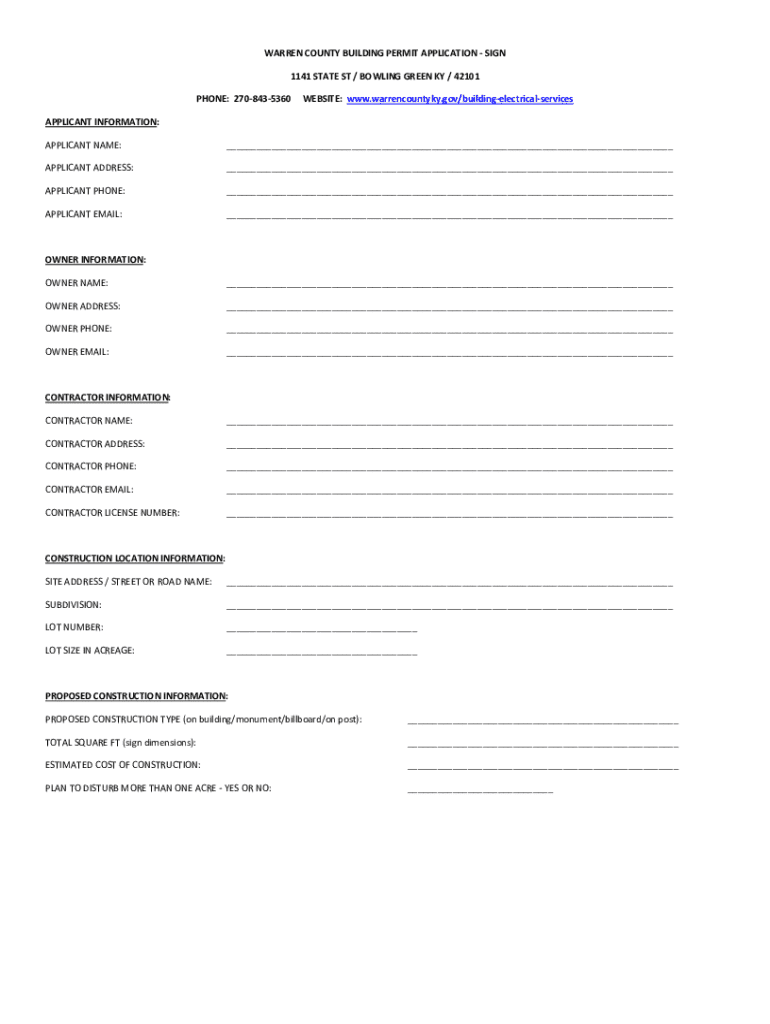 Information required on a Warren County building permit typically includes the project address, type of construction or renovation being done, estimated cost of the project, contractor information, and contact information for the property owner.