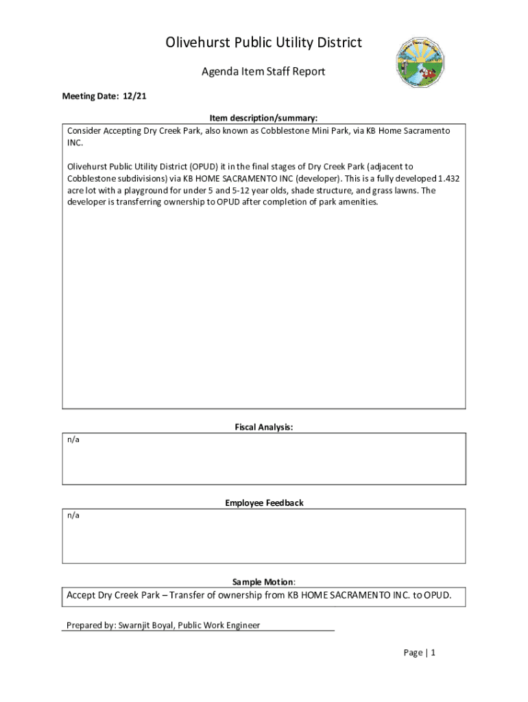 Consider Accepting Dry Creek Park, also known as Cobblestone Mini Park, via KB Home Sacramento