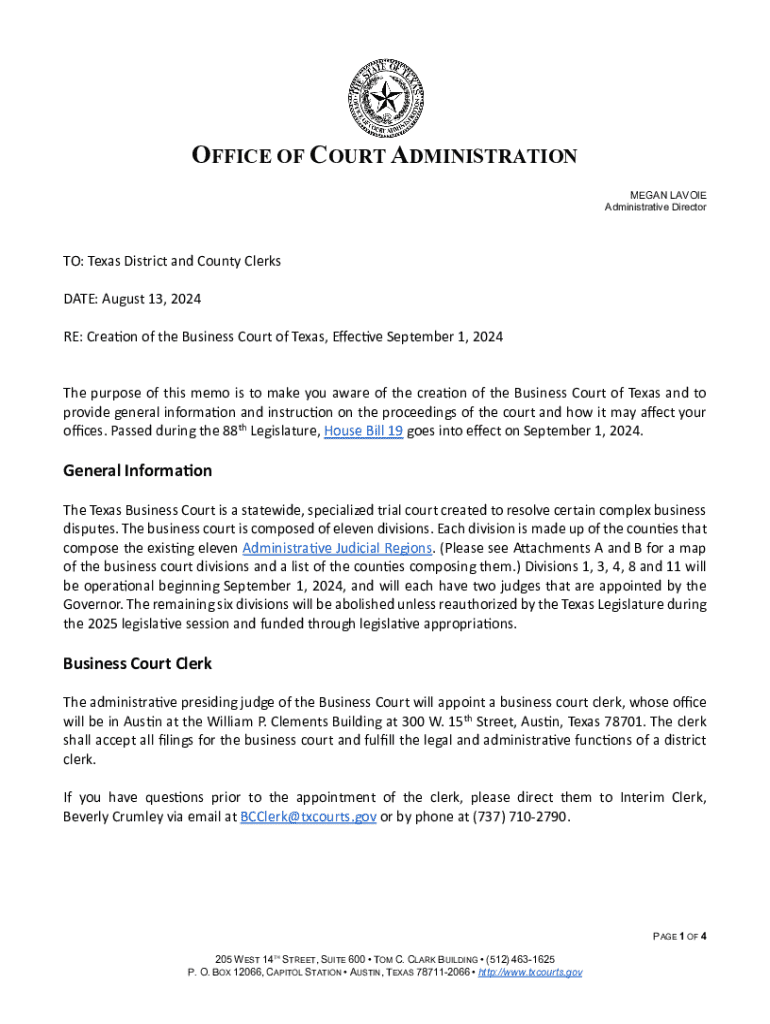 OFFICE OF COURT ADMINISTRATION MEGAN LAVOIE Administrative DirectorTO: Texas District and County Clerks DATE: August 13, 2024 RE: Creation of the Business Court of Texas, Eective September 1, 2024