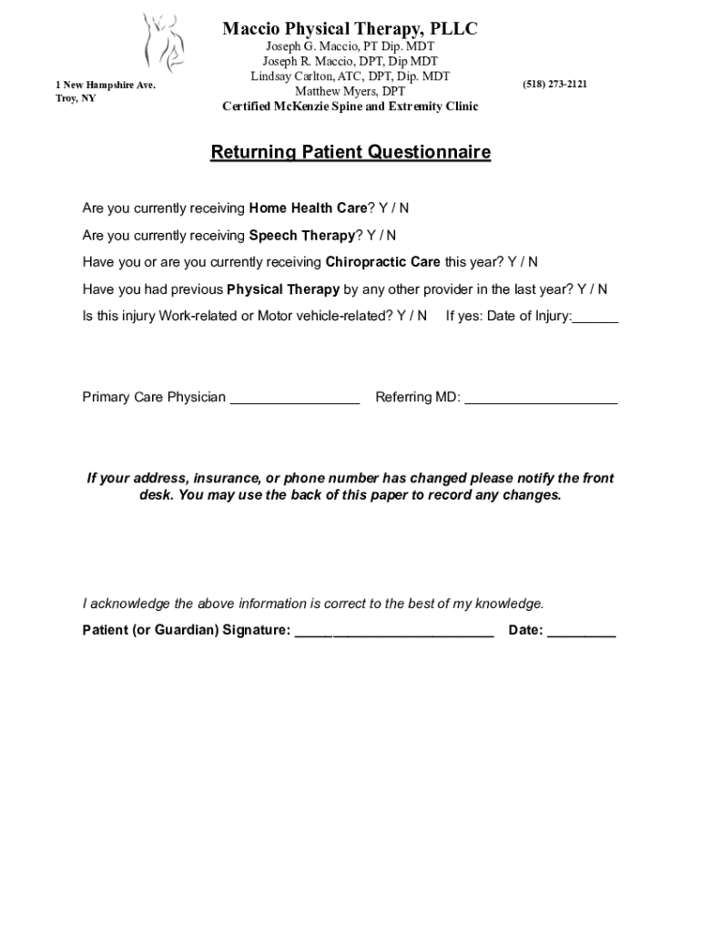 Returning patient questionnaire is a form that must be completed by patients who are returning for follow-up visits with their healthcare provider.
