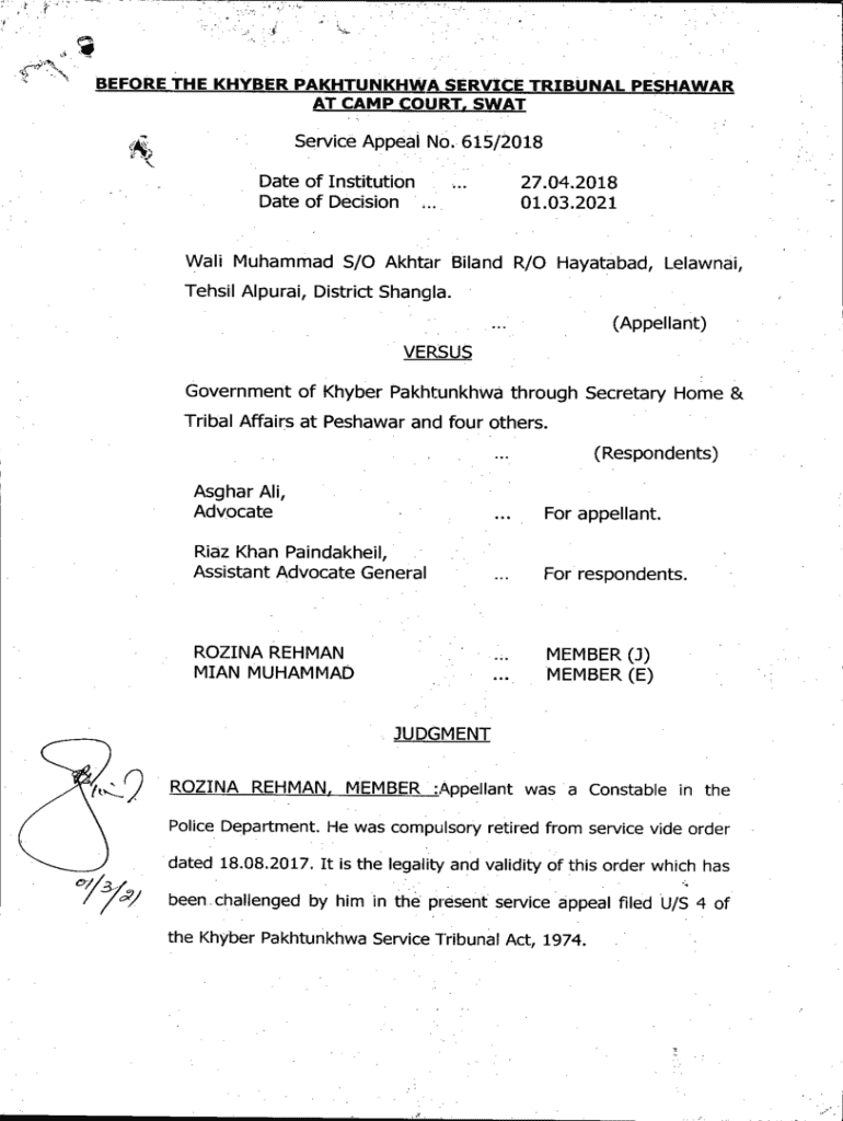 r \' 0 BEFORE THE KHYBER PAKHTUNKHWA SERVICE TRIBUNAL PESHAWAR AT CAMP COURT. SWAT Service Appeal No. 615/20181%Date of Institution Date of Decision ...27.04.2018 01.03.2021Wali Muhammad S/0 Akhtar