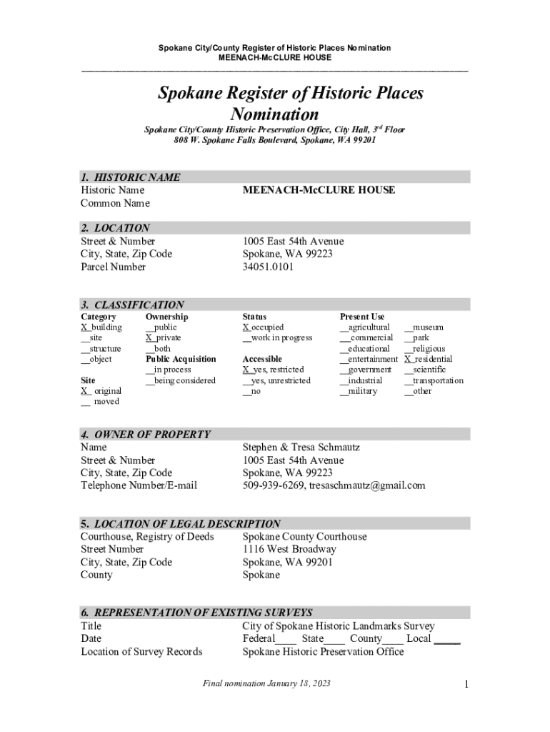 Spokane City/County Register of Historic Places Nomination MEENACHMcCLURE HOUSE ___Spokane Register of Historic Places NominationSpokane City/County Historic Preservation Office, City Hall, 3rd Floor