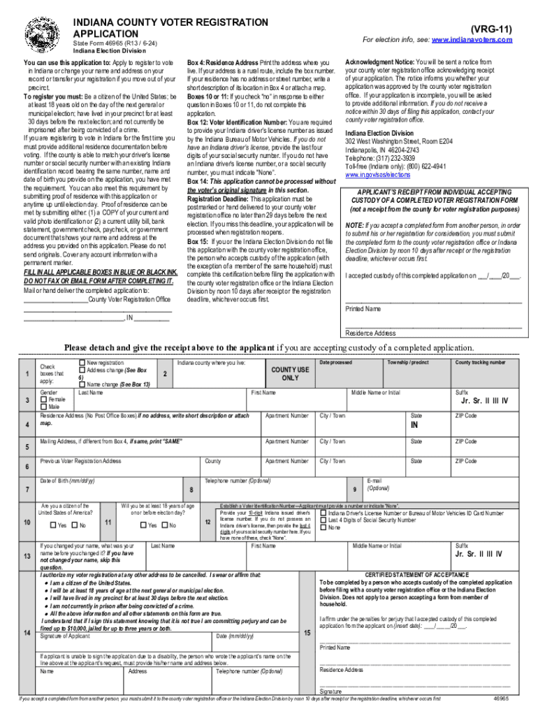 INDIANA COUNTY VOTER REGISTRATION APPLICATION(VRG11)For election info, see: www.indianavoters.comState Form 46965 (R13 / 624) Indiana Election Division can use this application to: Apply to register