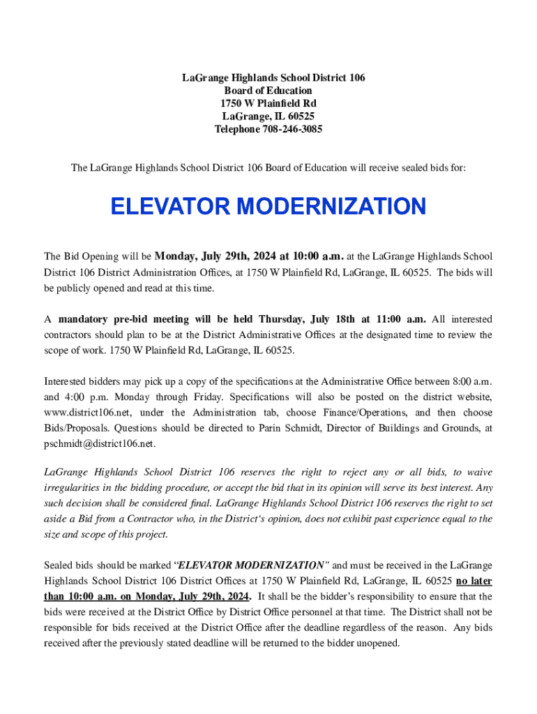 LaGrange Highlands School District 106 Board of Education 1750 W Plainfield Rd LaGrange, IL 60525 Telephone 7082463085The LaGrange Highlands School District 106 Board of Education will receive sealed