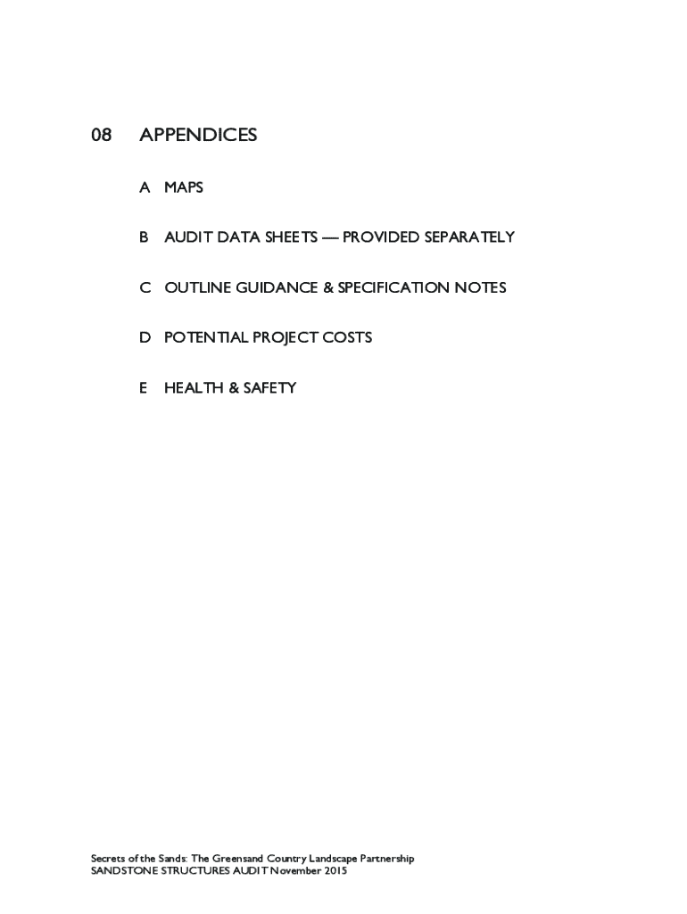 08APPENDICES A MAPS B AUDIT DATA SHEETS PROVIDED SEPARATELY C OUTLINE GUIDANCE & SPECIFICATION NOTES D POTENTIAL PROJECT COSTS EHEALTH & SAFETYSecrets of the Sands: The Greensand Country Landscape