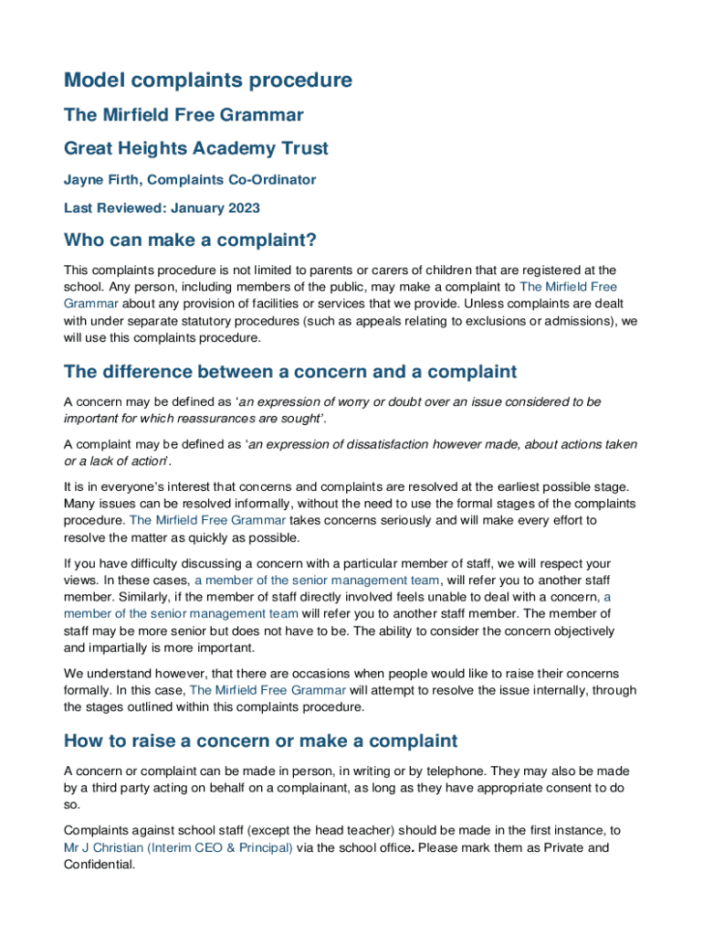 Model complaints procedure The Mirfield Free Grammar Great Heights Academy Trust Jayne Firth, Complaints CoOrdinator Last Reviewed: January 2023Who can make a complaint? This complaints procedure