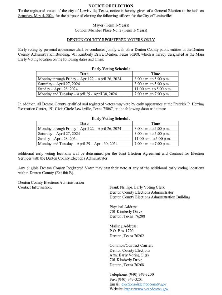 NOTICE OF ELECTION To the registered voters of the city of Lewisville, Texas, notice is hereby given of a General Election to be held on Saturday, May 4, 2024, for the purpose of electing the following
