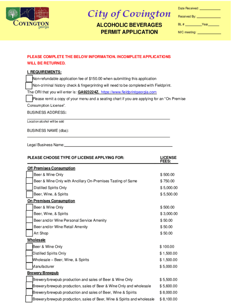 City of Covington ALCOHOLIC BEVERAGES PERMIT APPLICATIONDate Received: Received By: BL # M/C meeting:PLEASE COMPLETE THE BELOW INFORMATION. INCOMPLETE APPLICATIONS WILL BE RETURNED. I. REQUIREMENTS: