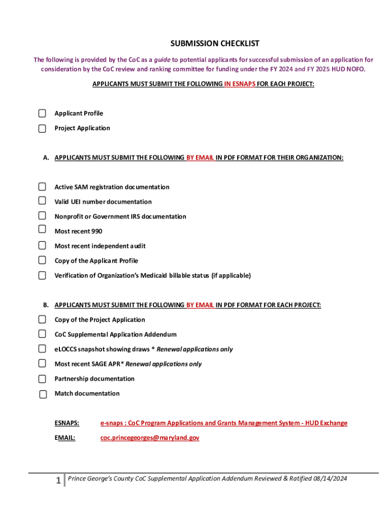 SUBMISSION CHECKLIST The following is provided by the CoC as a guide to potential applicants for successful submission of an application for consideration by the CoC review and ranking committee for