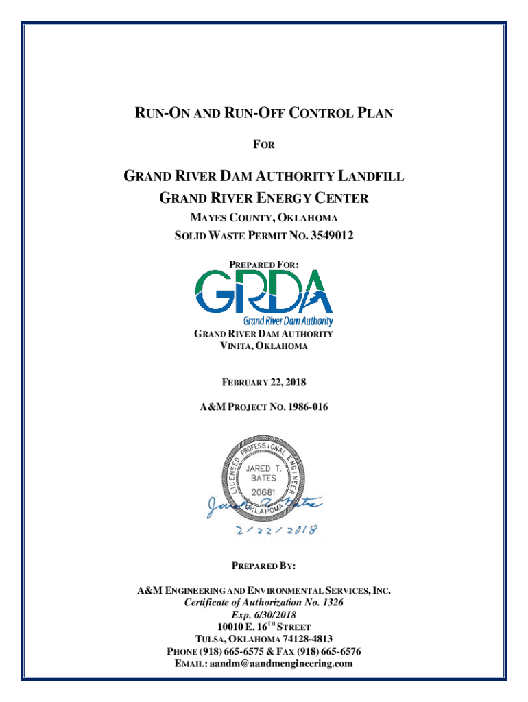 RUNON AND RUNOFF CONTROL PLAN FORGRAND RIVER DAM AUTHORITY LANDFILL GRAND RIVER ENERGY CENTER MAYES COUNTY, OKLAHOMA SOLID WASTE PERMIT NO. 3549012 PREPARED FOR:GRAND RIVER DAM AUTHORITY VINITA, OKLAHOMAFEBRUARY
