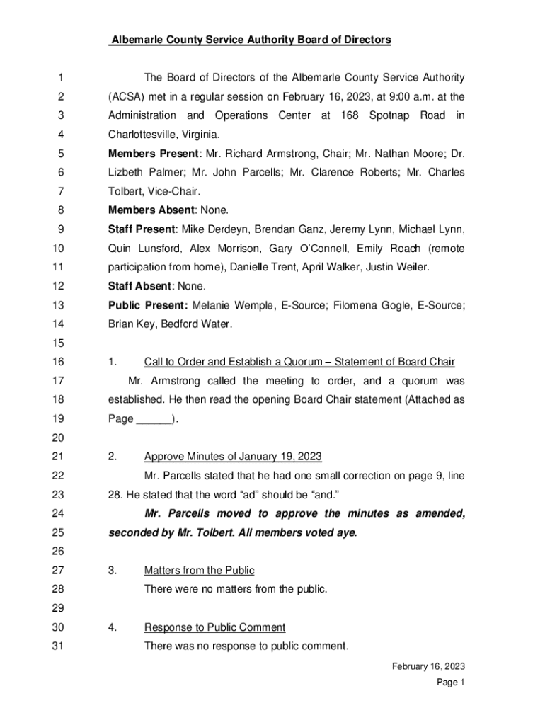 Albemarle County Service Authority Board of Directors1The Board of Directors of the Albemarle County Service Authority2(ACS) met in a regular session on February 16, 2023, at 9:00 a.m. at the3Administration4Charlottesville,