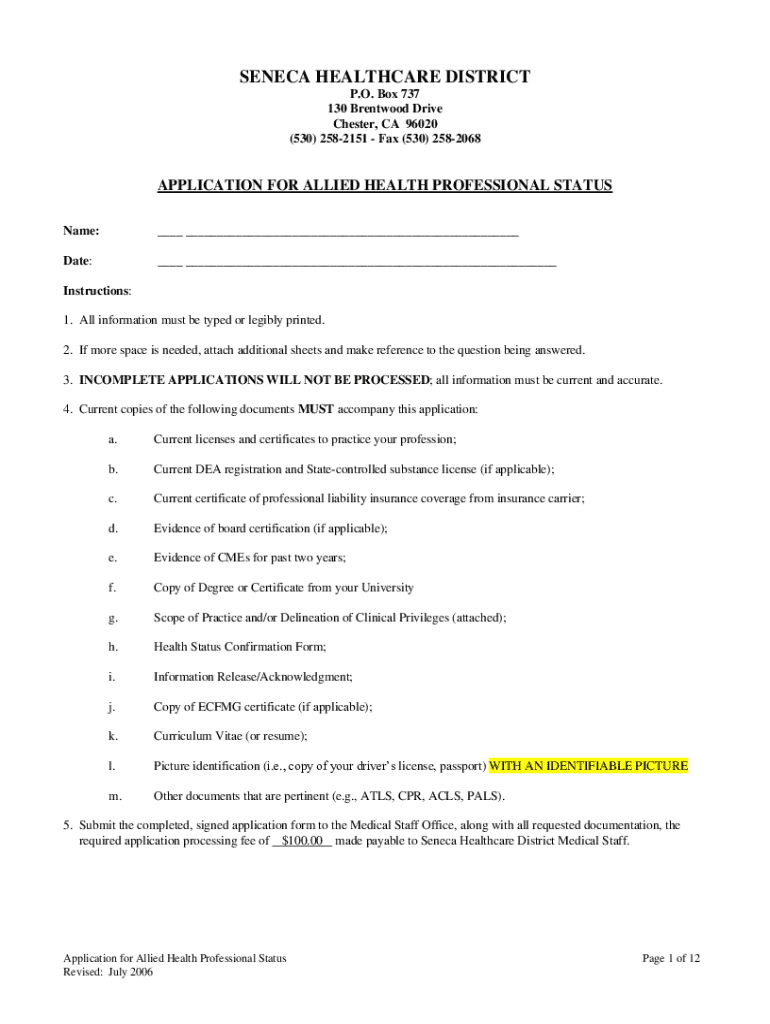 SENECA HEALTHCARE DISTRICT P.O. Box 737 130 Brentwood Drive Chester, CA 96020 (530) 2582151 Fax (530) 2582068APPLICATION FOR ALLIED HEALTH PROFESSIONAL STATUS Name:___ ___Date:___ ___Instructions:
