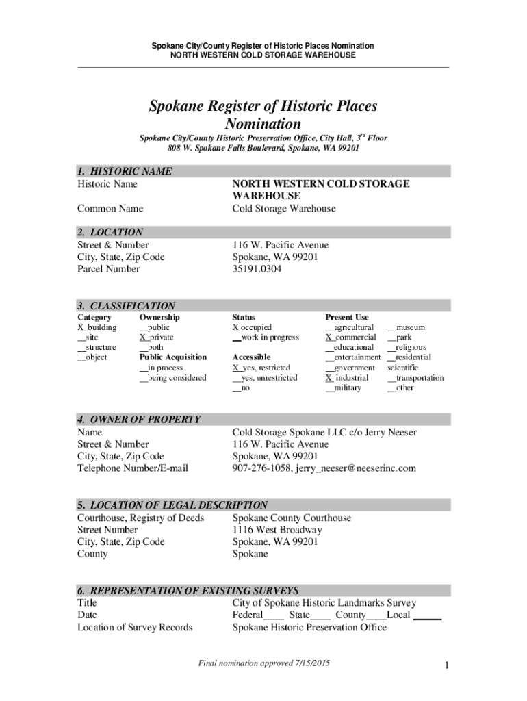 Spokane City/County Register of Historic Places Nomination NORTH WESTERN COLD STORAGE WAREHOUSESpokane Register of Historic Places Nomination Spokane City/County Historic Preservation Office, City