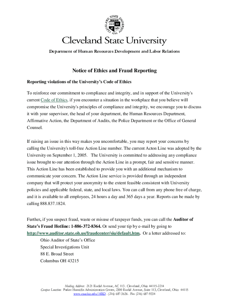 Department of Human Resources Development and Labor RelationsNotice of Ethics and Fraud Reporting violations of the Universities Code of Ethics