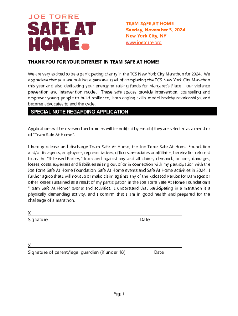 TEAM SAFE AT HOME Sunday, November 3, 2024, New York City, NY www.joetorre.orgTHANK YOU FOR YOUR INTEREST IN TEAM SAFE AT HOME! We are very excited to be a participating charity in the TCS New York