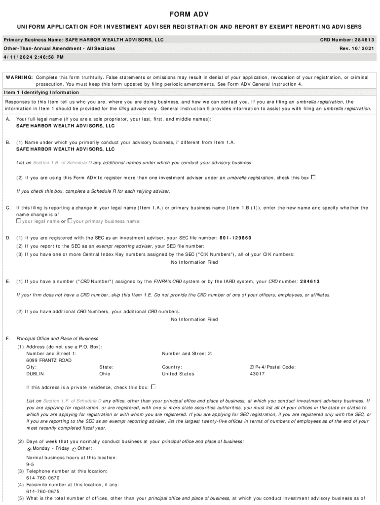 FORM ADV UNIFORM APPLICATION FOR INVESTMENT ADVISER REGISTRATION AND REPORT BY EXEMPT REPORTING ADVISERS Primary Business Name: SAFE HARBOR WEALTH ADVISORS, LLCCRD Number: 284613OtherThanAnnual Amendment