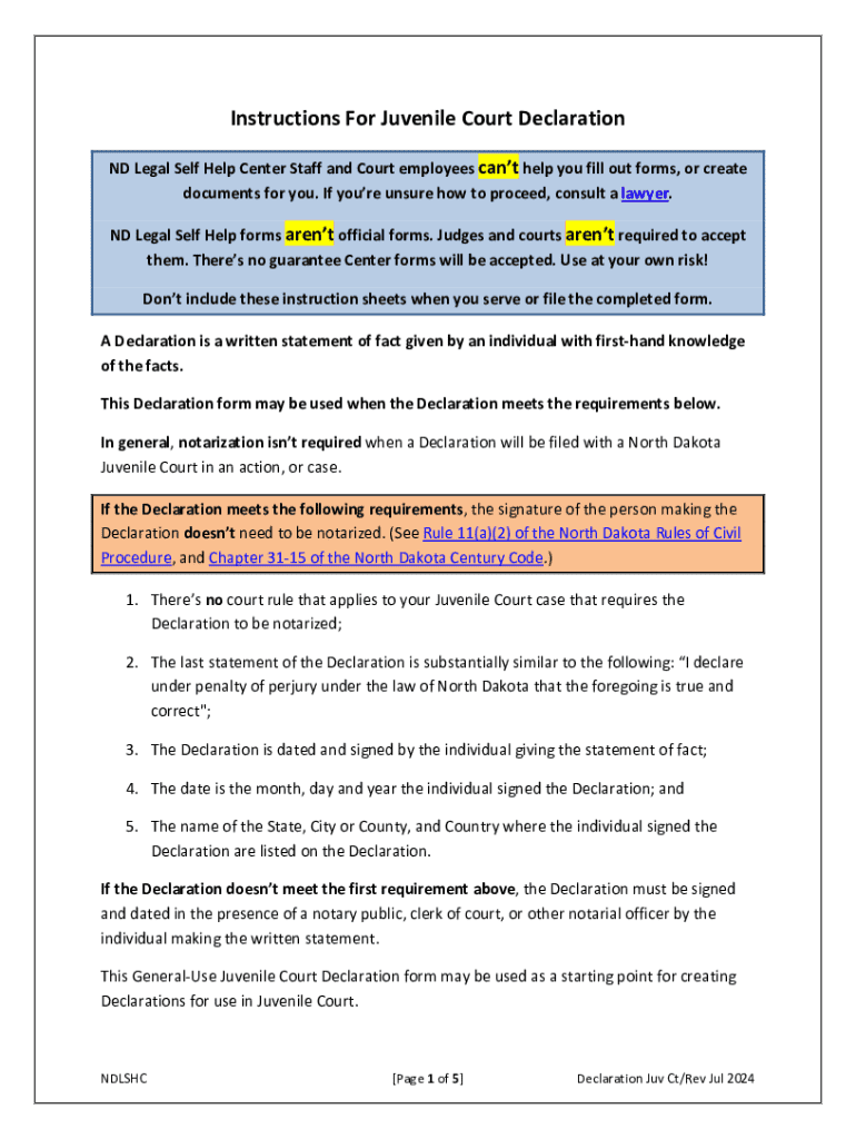 Instructions For Juvenile Court Declaration ND Legal Self Help Center Staff and Court employees cant help you fill out forms, or create documents for you. If youre unsure how to proceed, consult a