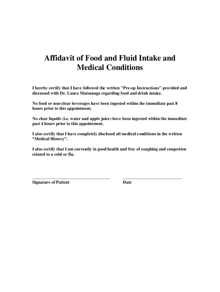 Affidavit of Food and Fluid Intake and Medical Conditions I hereby certify that I have followed the written \"Preop Instructions\" provided and discussed with Dr. Laura Matsunaga regarding food and