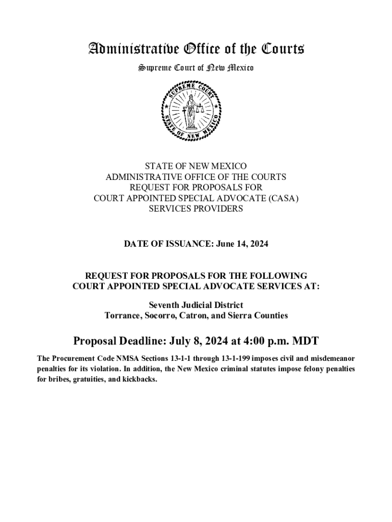 Administrative Office of the Courts Supreme Court of New MexicoSTATE OF NEW MEXICO ADMINISTRATIVE OFFICE OF THE COURTS REQUEST FOR PROPOSALS FOR COURT APPOINTED SPECIAL ADVOCATE (CASA) SERVICES PROVIDERS