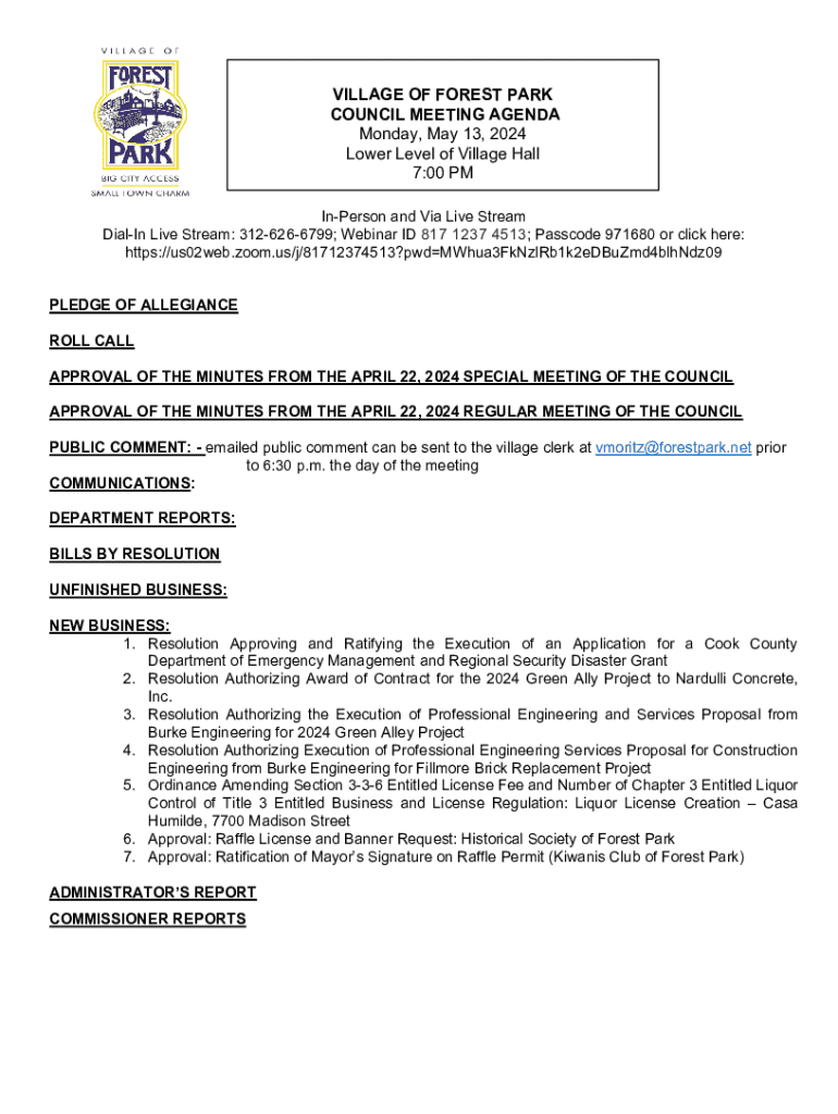 VILLAGE OF FOREST PARK COUNCIL MEETING AGENDA Monday, May 13, 2024, Lower Level of Village Hall 7:00 PM Unperson and Via Live Stream Dialing Live Stream: 3126266799; Webinar ID 817 1237 4513; Passcode