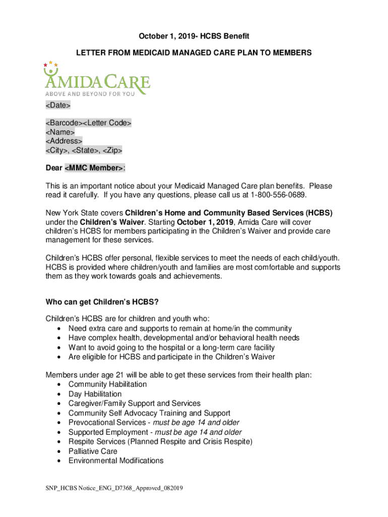October 1, 2019, HUBS Benefit LETTER FROM MEDICAID MANAGED CARE PLAN TO MEMBERSDate BarcodeLetter Code Name Address City, State, Zip Dear MMC Member: This is an important notice about your Medicaid