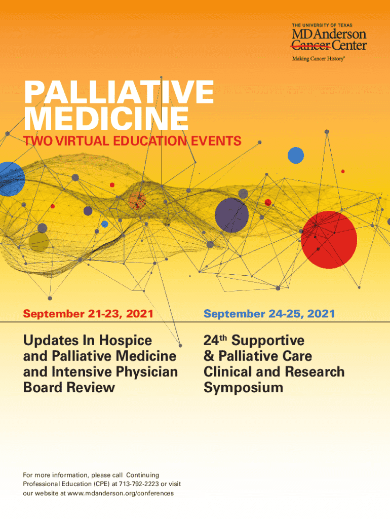 PALLIATIVE MEDICINE TWO VIRTUAL EDUCATION EVENTSSeptember 2123, 2021September 2425, 2021Updates In Hospice and Palliative Medicine and Intensive Physician Board Review24th Supportive & Palliative