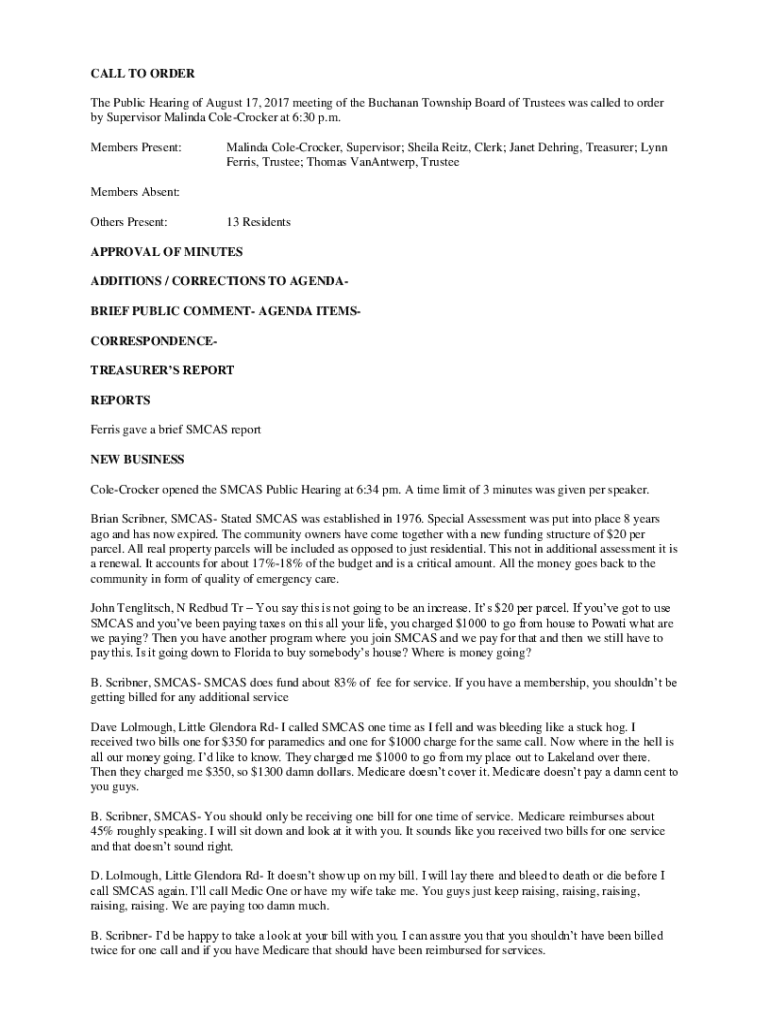 The Public Hearing of August 17, 2017, meeting of the Buchanan Township Board of Trustees was called to order