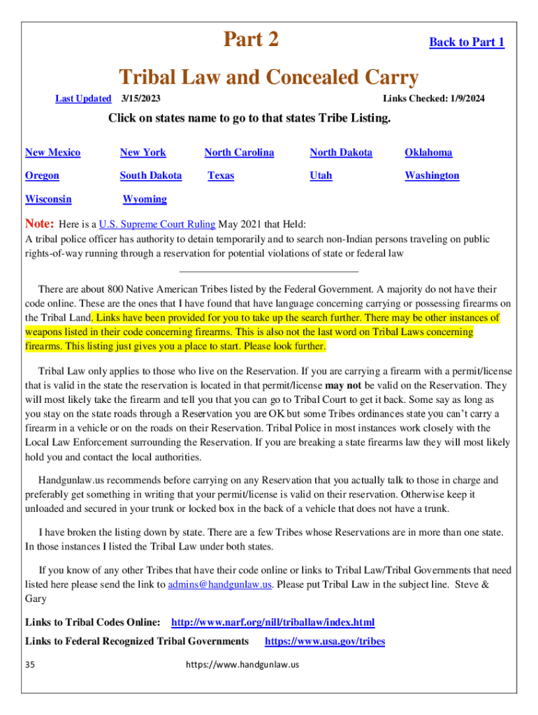 Part 2Back to Part 1Tribal Law and Concealed Carry Last Updated3/15/2023Links Checked: 1/9/2024Click on states name to go to that states Tribe Listing. New Medicine York North Carolina North DakotaOklahomaOregonSouth