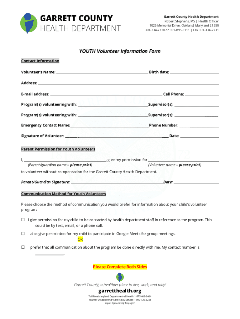 Garrett County Health Department Robert Stephens, MS | Health Officer 1025 Memorial Drive, Oakland, Maryland 21550 3013347730 or 3018953111 | Fax 3013347731YOUTH Volunteer Information Form Contact