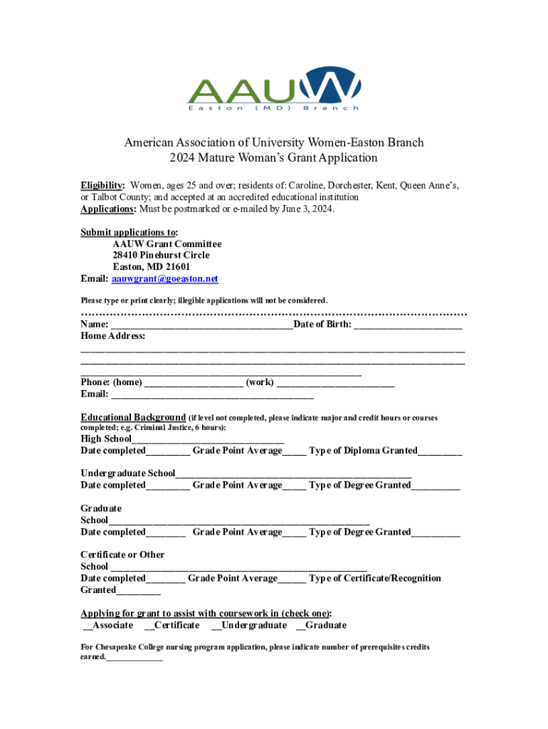 American Association of University WomenEaston Branch 2024 Mature Women Grant Application Eligibility: Women, ages 25 and over; residents of: Caroline, Dorchester, Kent, Queen Anne's, or Talbot County;