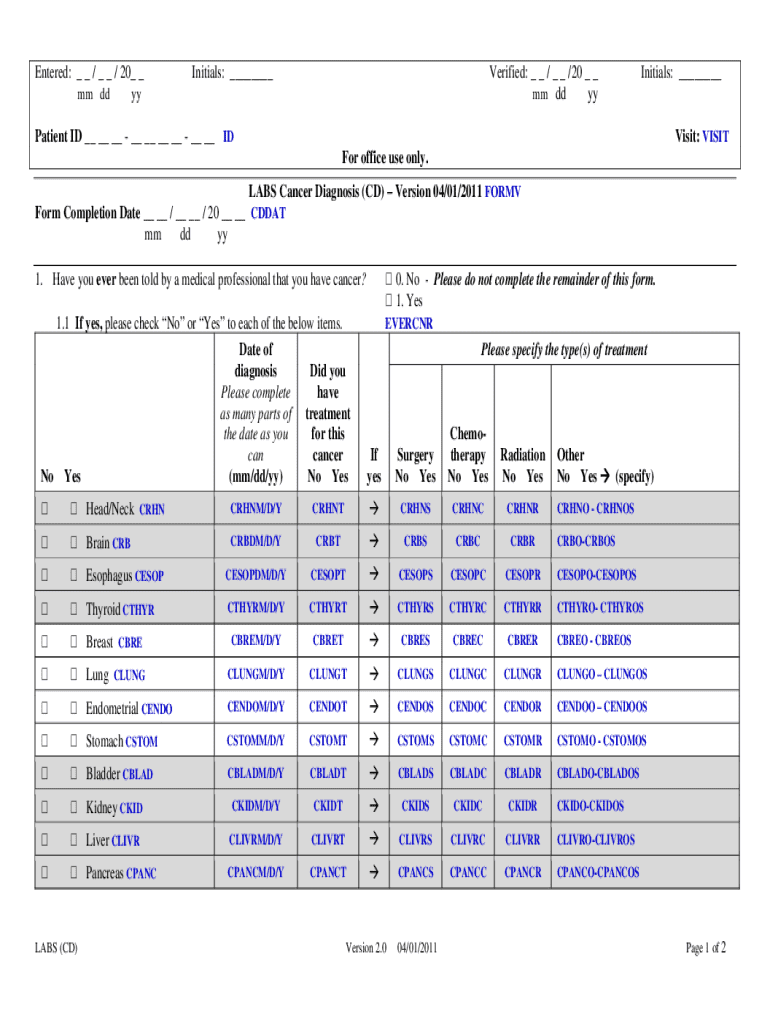 Entered: _ _ / _ _ / 20_ _ mm initials: ___Verified: _ _ / _ _ /20 _ _ mm dd yyyyInitials: ___Patient ID __ __ __ __ __ __ __ __ __ Visit: VISIT For office use only. LABS Cancer Diagnosis (CD) Version