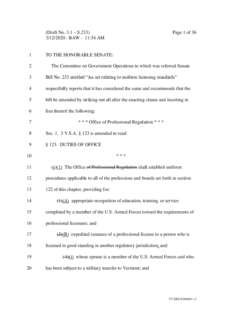 (Draft No. 3.1 S.233) 3/12/2020 BAW 11:54 AM1 2Page 1 of 36TO THE HONORABLE SENATE: The Committee on Government Operations to which was referred Senate3Bill No. 233 entitled An act relating to uniform