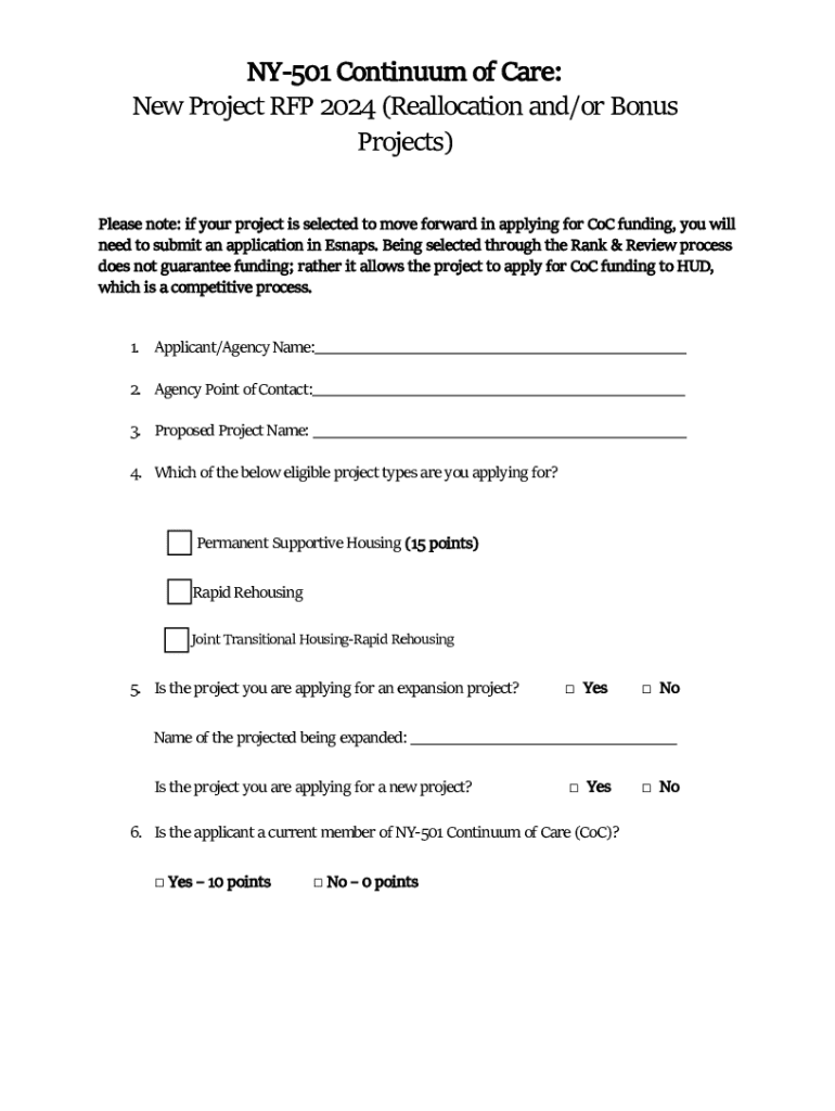 NY501 Continuum of Care: New Project RFP 2024 (Reallocation and/or Bonus Projects) Please note: if your project is selected to move forward in applying for CoC funding, you will need to submit an
