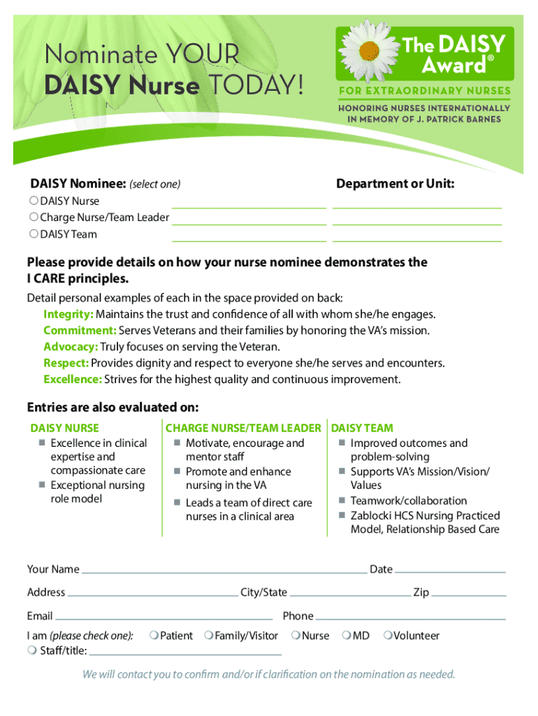 Individuals or organizations that want to nominate a nurse for the Daisy Award are required to submit a nomination form.