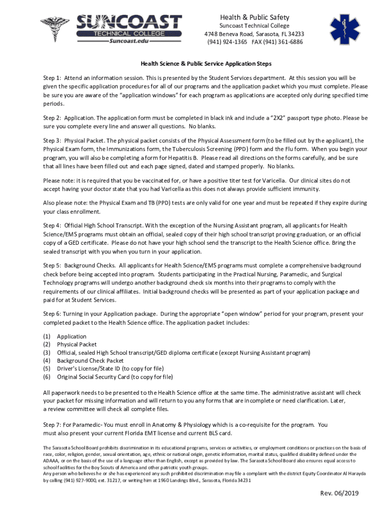 Health & Public Safety Sun coast Technical College 4748 Geneva Road, Sarasota, FL 34233 (941) 9241365 FAX (941) 3616886 Health Science & Public Service Application Steps Step 1: Attend an information