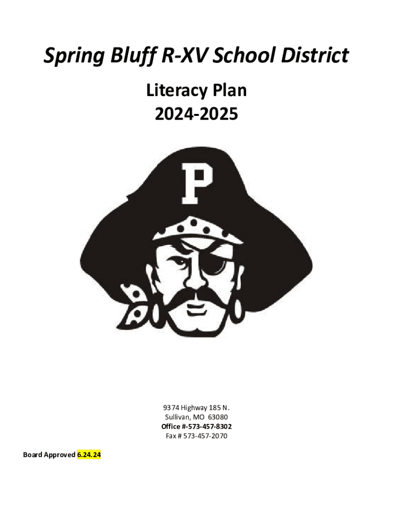 Spring Bluff REV School District Literacy Plan 202420259374 Highway 185 N. Sullivan, MO 63080 Office #5734578302 Fax # 5734572070 Board Approved 6.24.24General Purpose Early literacy education is