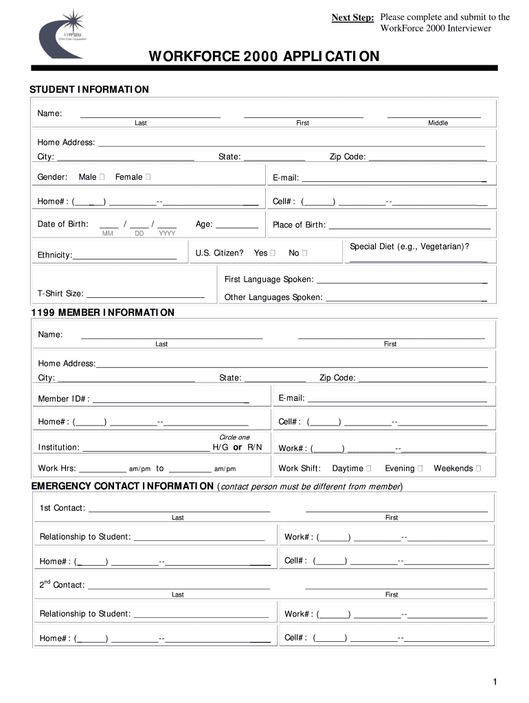Next Step: Please complete and submit to the Workforce 2000 Interviewer WORKFORCE 2000 APPLICATION STUDENT INFORMATION Name: Last First Middle Home Address: City: Gender: Male State: Zip Code: Email: