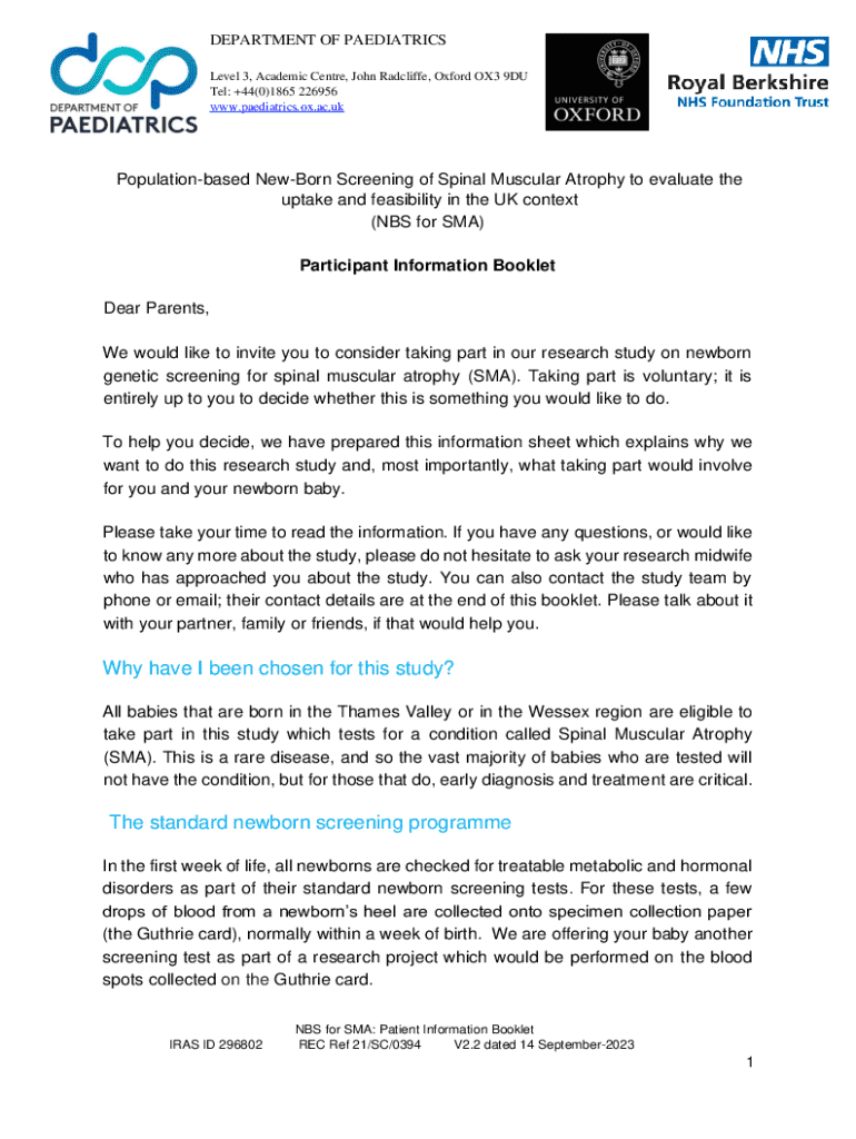 DEPARTMENT OF PEDIATRICS Level 3, Academic Center, John Radcliffe, Oxford OX3 9DU Tel: +44(0)1865 226956 www.paediatrics.ox.ac.ukPopulationbased Newborn Screening of Spinal Muscular Atrophy to evaluate